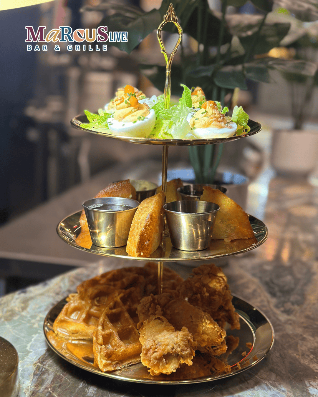 Introducing The Marcus Experience, a new shareable tower featuring deviled eggs, M’s cornbread, crispy wings, and cornbread waffles.